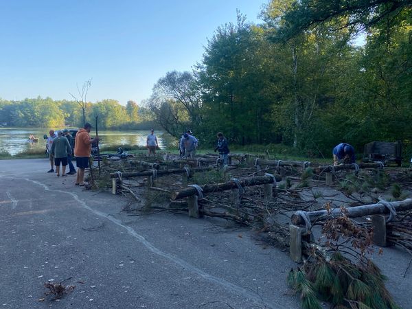 On Saturday, September 20th, volunteers constructed 12 "half-log" fish habitat structures. Each structure is made from an eight-foot oak log that is sawed in half lengthwise. The log is attached with 1" rope to two concrete blocks. Then the holes in the blocks are stuffed with pine branches which are secured to the blocks. The structures are then placed in 4 to 8 feet of water. Once in place, algae attach to the branches which then attract phytoplankton, which attract small minnows. The minnows then have a place to safely hang out, reproduce, and ultimately provide a prolific food source for game fish. The more food at the bottom of the food chain provides more food for the game fish. The more game fish in the lake the better the fishing!